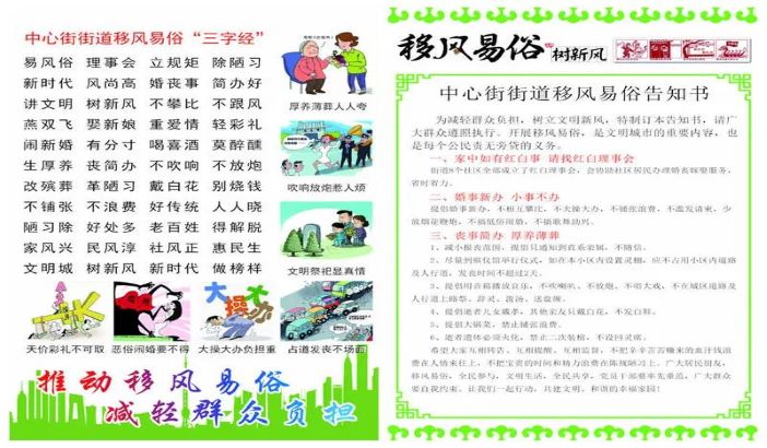 宣傳引導,“引”出移風易俗新理念。棗莊市市中區中心街街道為唱樹文明新風,該街道從宣傳教育入手,構建“線上”“線下”立體宣傳格局。“線上”通過“中心街 忠心人”微信公眾號平臺刊發移風易俗倡議書、公益廣告等80余條。“線下”利用戶外宣傳橫幅、宣傳欄、LED電子顯示屏等方式刊播移風易俗宣傳標語、公益廣告600余幅。同時,以新時代文明實踐所(站)為陣地,成立志愿服務隊,開展多項宣傳活動,大力弘揚美德健康的生活方式。