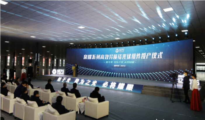 儀式現場,陳平、張宏偉等與會人員首先參觀了泉為公司展廳和生產線,隨后共同為首塊“泉耀系列高效異質結組件”產品揭幕。