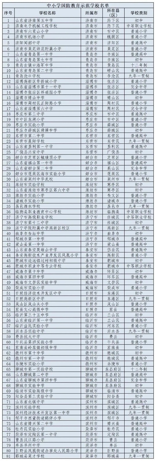 近日,教育部、中央軍委政治工作部聯(lián)合印發(fā)通知,認(rèn)定公布全國新創(chuàng)建942所中小學(xué)國防教育示范學(xué)校,山東有81所學(xué)校入選,創(chuàng)建數(shù)量列全國首位。