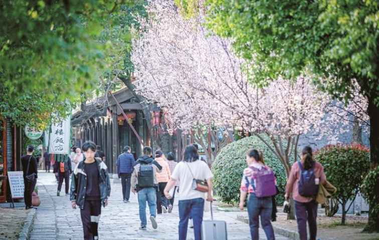 近日,臺(tái)兒莊古城里百花盛開,生機(jī)盎然,到處洋溢著濃濃的春意。柳枝在風(fēng)中舞動(dòng),隨處可見的紫葉李艷麗動(dòng)人,連翹、桃花、海棠也要次第綻放,讓游客看到一場春天花事。(記者 王龍飛 通訊員 孔闖 攝)