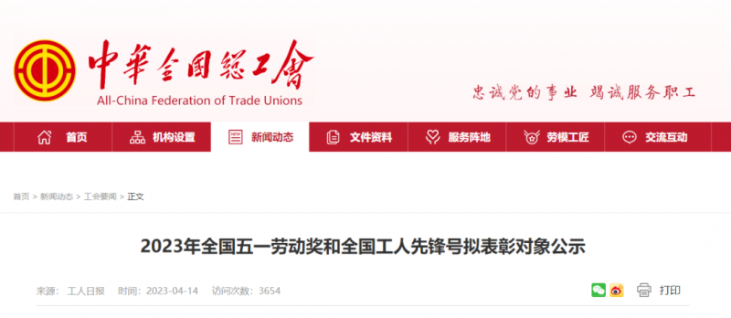 4月14日,中華全國總工會發布2023年全國五一勞動獎和全國工人先鋒號擬表彰對象公示名單,棗莊這些單位、個人榜上有名。
