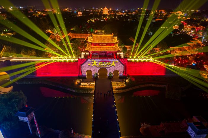 夜幕降臨,臺兒莊古城華燈璀璨,全國非物質文化遺產演出火龍鋼花、《河聲》、《水月吟》等豐富多彩的夜間演出,內河搖櫓船等獨具水鄉特色的夜間體驗,市樓燈光秀、西門投影秀、迎賓秀等,將燈光與音樂、建筑與微演藝完美結合,相互交織在一起,為游客呈現如夢似幻的視覺盛宴。