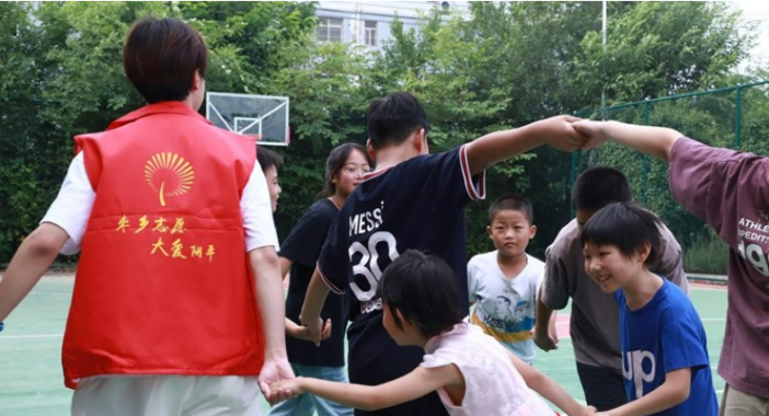 在學習之余,志愿者們還會帶著孩子們做一些小游戲放松身心,今天他們進行的是往返接力跑和鉆門洞的游戲,孩子們在玩耍中收獲了友誼,臉上洋溢著天真爛漫的笑容。“我爸爸媽媽平時都要出去上班,家里就剩我一個人,我能來這里上自習特別好,這些大學生哥哥姐姐們對我們的功課幫助很大,我們都很感謝他們。”學生侯奕羽感激地說道。