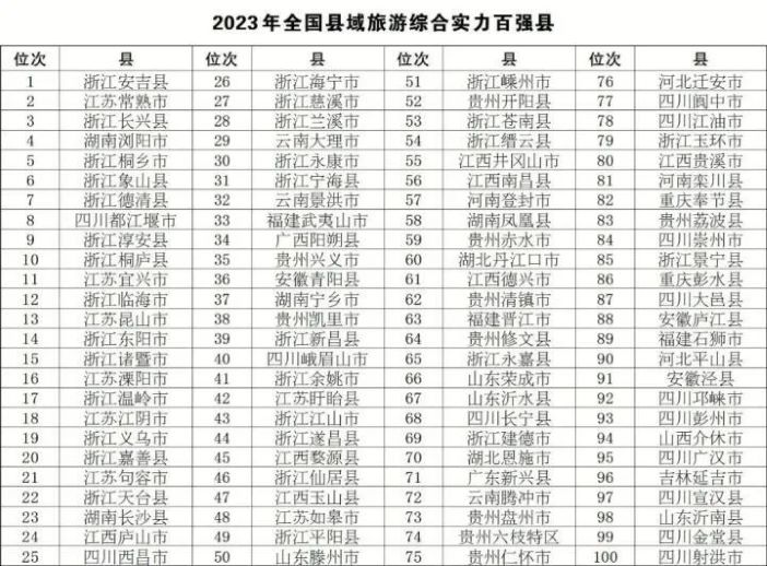 “2023年全國縣域旅游綜合實力百強縣”分布在18個省份。具體分布為:浙江32席,四川14席,貴州10席,江蘇8席,江西7席,湖南和山東均占4席,安徽、福建和云南均占3席,河北、河南、湖北和重慶各占2席,廣東、廣西、吉林和山西均為1席。