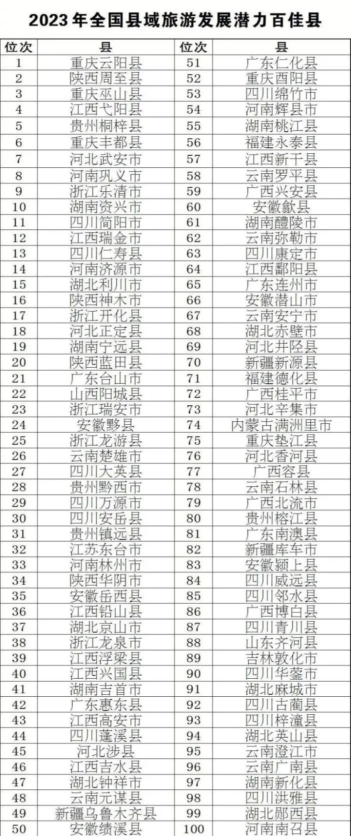 “2023年全國縣域旅游發(fā)展?jié)摿Π偌芽h”分布在21個省份。具體分布為:四川15席,江西9席,云南8席,湖北7席,安徽、河北、湖南均占6席,廣東、廣西、河南、浙江、重慶各5席,貴州、陜西各4席,新疆3席,福建2席,吉林、江蘇、內(nèi)蒙古、山東、山西各1席。