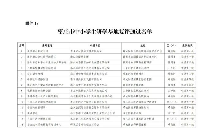 根據棗莊市教育局、棗莊市發展和改革委員會、棗莊市文化和旅游局聯合下發的《關于組織開展第二批市級中小學生研學基地及優秀研學課程評選工作的通知》和《關于組織開展市級研學基地評估工作的通知》精神,參照《山東省省級中小學生研學基地管理辦法》(以下簡稱《管理辦法》)相關要求,在我市研學基地自愿申報和區(市)教體局及市直相關部門推薦的基礎上,市教育局組織專家對全市申請復評的研學基地和第二批申報的研學基地項目及研學課程進行了評審,擬確定鐵道游擊隊紀念園等14個研學基地通過復評;臺兒莊大戰紀念館等18個申報項目為第二批市級中小學生研學基地,10門申報課程為第二批市級優秀研學課程,現將名單予以公示。
