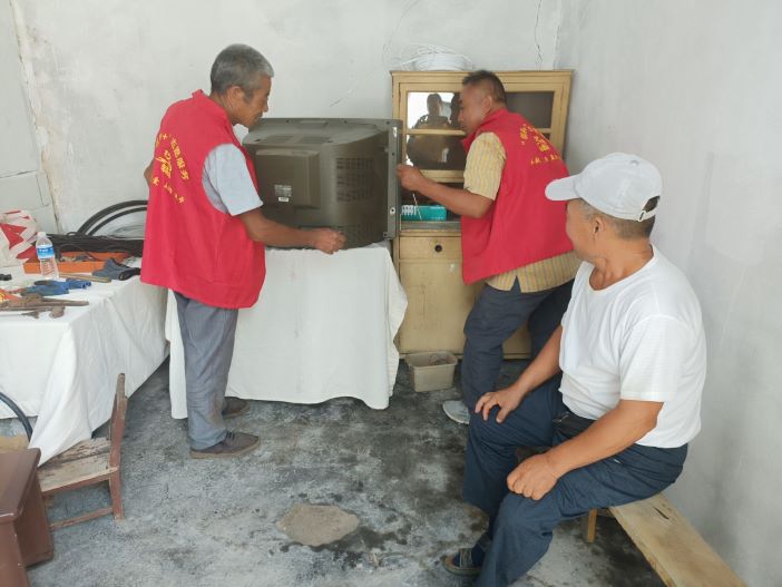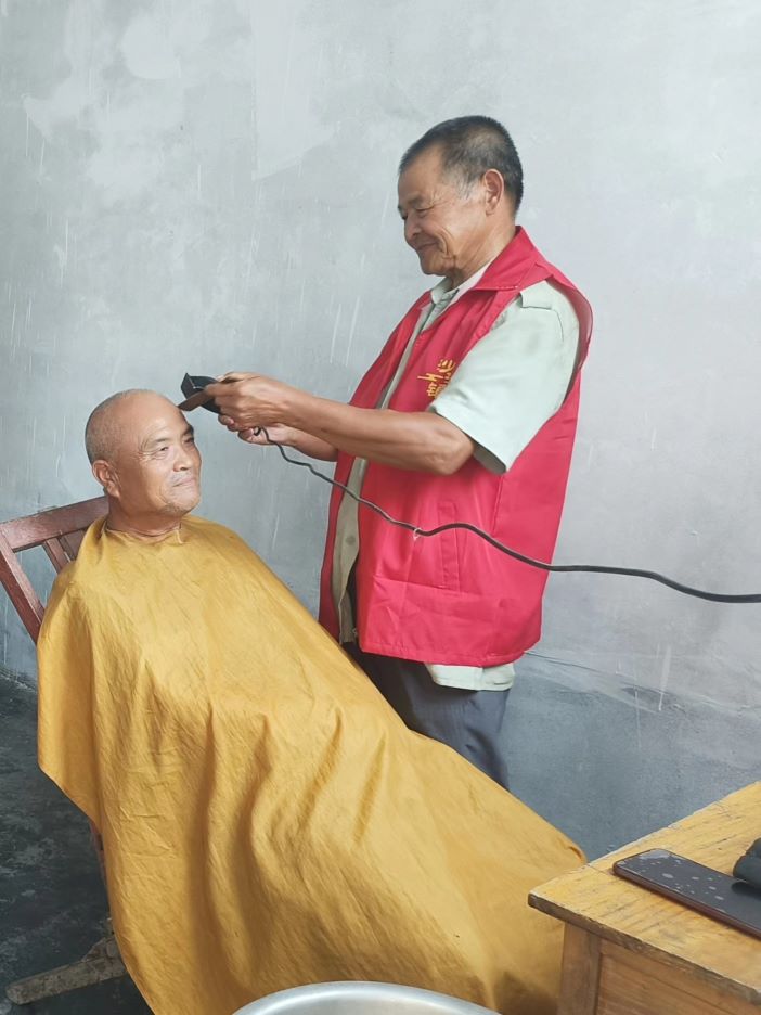 像韓大爺這樣的還有很多,每到周六周日,巖湖村老年人紛紛來到村里的“惠民小院”,有的到活動室下棋娛樂,有的到理發室享受志愿者提供的免費理發服務,有的到維修鋪維修家里的小家電,有的三三兩兩聚集在美德信用議事廳里嘮嗑聊家常,整個小院內有說有笑,其樂融融,十分熱鬧。歡樂的小院中,身穿紅馬甲的志愿者給老人們理發,還有志愿者幫助洗衣、修家電。