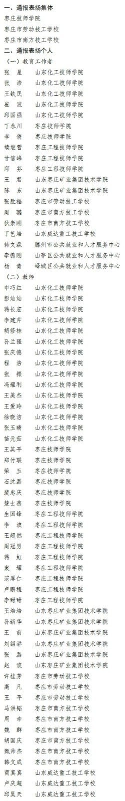 近年來,全市技工院校和廣大教職員工堅持立德樹人根本任務,緊貼產業發展需求,為經濟社會發展培養了大批高素質技能人才,涌現出一批為我市技工教育事業和技能人才隊伍建設作出積極貢獻的集體和個人。為鼓勵先進,推動全市技工院校高質量發展,激勵廣大教師和教育工作者獻身技工教育事業,市人力資源社會保障局決定,對棗莊技師學院3個集體和張星等67名個人給予通報表揚。