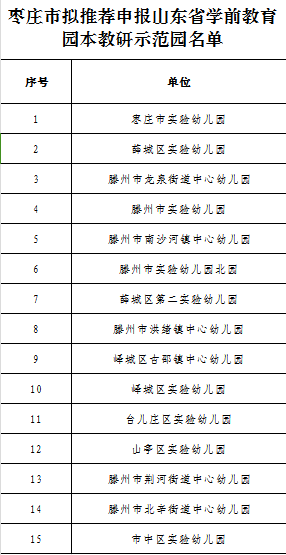 根據《山東省學前教育中心關于開展山東省學前教育園本教研示范園創建工作的通知》(魯教學前中心〔2023〕27號)要求,棗莊市教育科學研究院組織專家通過現場評審、活頁盲評的方式,對27所申報山東省學前教育園本教研示范園的園所進行了市級評審。根據專家評審意見和我市分配名額,擬推薦棗莊市實驗幼兒園等15所幼兒園參與省級評選?,F將擬推薦名單予以公示(見附件)。