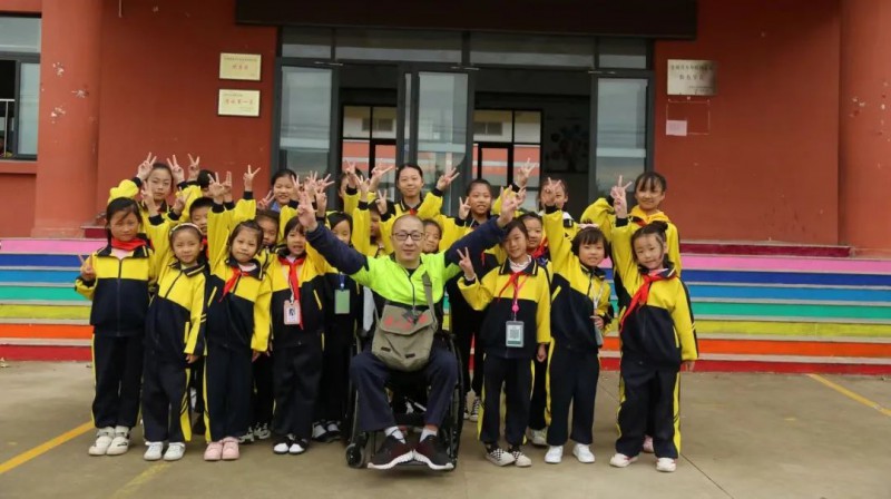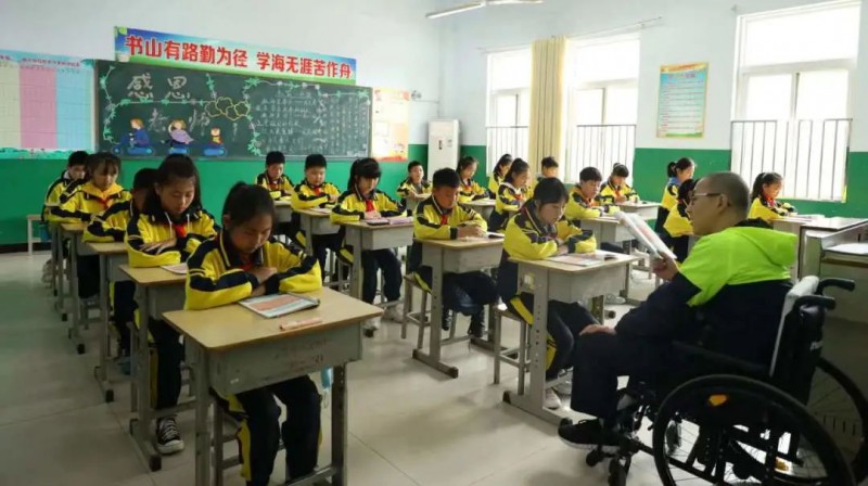 2018年秋季開學,他終于回到了魂牽夢系的校園,重新輪椅進教室,用感恩的心繼續著他的教育事業,讓他激動不已。但是剛回到學校時他是害怕的、沒有信心的,最怕的是因為行動受限無法上好每一堂課,耽誤工作,耽誤孩子,耽誤教育。在校長和其他老師的幫助下,他競聘到四年級《英語》和三年級的《道德與法治》。他很珍惜這次機會,為了上好每一堂課,為了高質量完成教學工作,他付出了比常人更多的努力。一輛輪椅,成為他的雙腿;一米高的小黑板,是他寫板書的大舞臺;一個斜跨的黃書包,是他課堂上的小書桌,這就是他的“三尺講臺”,他和學生們一起聽聽力、說對話、讀單詞、寫句子。漸漸地,坐在輪椅上的他成了學生的良師益友,學生也從起初的好奇、迷惑和害怕逐步變為接受,詢問和照顧,他也忘記了自己是坐在輪椅上的老師了。2019年,在學校領導和老師的鼓勵幫助下,他鼓起勇氣承接了區級英語公開課,在多次請教專業英語老師和自己的鉆研后,成功的上了他人生中的重要一課,得到了區級領導和同行們的認可,更是對他人生價值的認可。