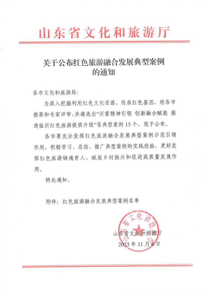 為深入挖掘利用紅色文化資源,傳承紅色基因,經各市推薦和專家評審,共遂選出“沂蒙精神引領 創新融合賦能 推進臨沂紅色旅游提質升級”等典型案例15 個,現予公布。