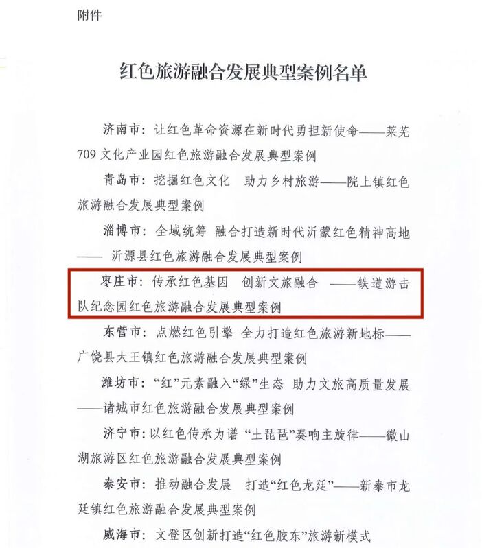 我市“傳承紅色基因 創新文旅融合——鐵道游擊隊紀念園紅色旅游融合發展典型案例”入選。