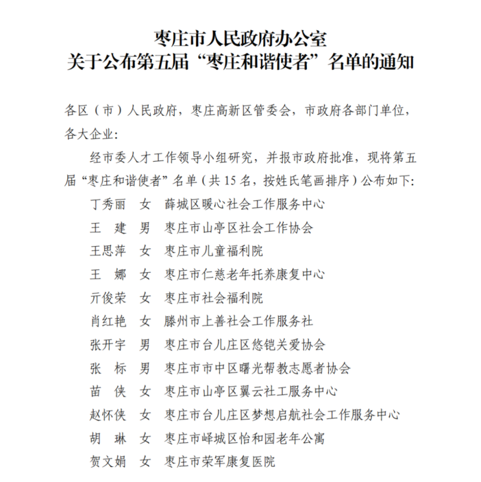 關于公布第五屆“棗莊和諧使者”名單的通知