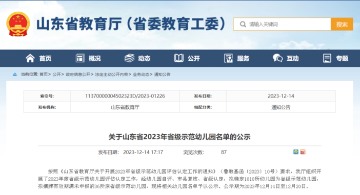 《關于山東省2023年省級示范幼兒園名單的公示》