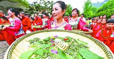 2017年立夏當(dāng)天,杭州市民托著“泥貓守蠶”竹匾參加傳統(tǒng)的“送春迎夏”儀式。新華社發(fā)