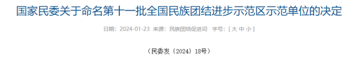 為激勵先進,示范引領,經過嚴格評選,國家民委決定命名中國人民抗日戰爭紀念館等248個地方和單位為第十一批全國民族團結進步示范區示范單位,命名有效期5年。希望被命名的地方和單位珍惜榮譽、再接再厲,把持續扎根鑄牢中華民族共同體意識落實到各項工作中,探索更多經驗、爭取更大作為,為新時代黨的民族工作高質量發展作出新的貢獻。