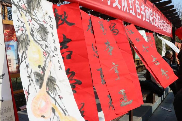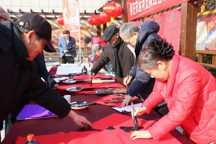 為了讓本次活動更加豐富立體,棗莊市運河支隊紅色書畫院的書法繪畫大師們來到活動現(xiàn)場,將新春的美好祝福通過字畫送福到百姓家門口。各位大師們揮毫潑墨、妙筆丹青,一幅幅寓意美好的對聯(lián)、一張張充滿祝愿的福字、一幅幅靈動飄逸的畫作,成為了群眾們的“心頭好”。活動現(xiàn)場一側(cè),“黃河大集”里的本土非遺作品、特色農(nóng)產(chǎn)品、民俗小吃等,讓村里的鄉(xiāng)味更足了,年味更濃了。