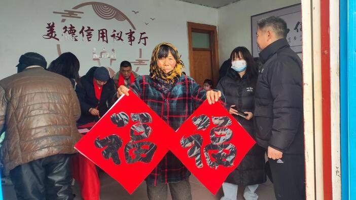 活動中,書法家們凝神聚氣,揮毫潑墨,大顯身手,書寫不同字體的福字,把最好的祝福送給群眾。群眾圍在書法家旁排隊等候,一張張福字不一會兒就被“搶”空,群眾在領取福字的同時,也領略了書法的魅力,活動現場充滿了濃濃的年味。志愿者們在現場協助,同時向村民們宣傳誠信文化、普及個人誠信知識,增強村民的“知信、用信、守信”意識。