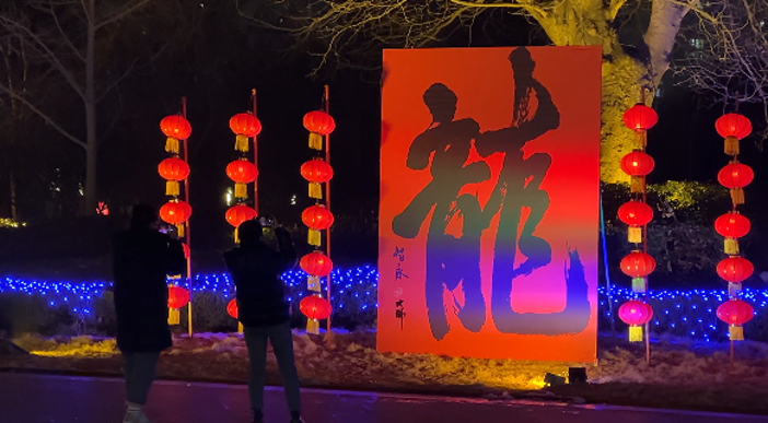 張燈結彩人團圓,流光溢彩迎新春。在棗莊市市中區東湖公園,活靈活現的卡通龍型花燈、充滿韻味的燈籠長廊交相輝映,美輪美奐。人們漫步其中,滿目燈火旖旎,濃濃的年味撲面而來。 市民韓雅如說, 今天來到了東湖新春游園會,看到了小龍人還有龍的字畫。今年是龍年,祝大家龍年行大運,回家過大年。