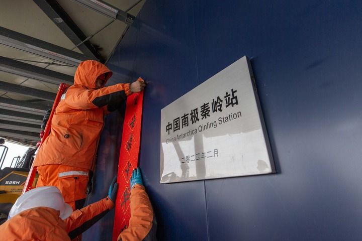 2024年2月9日,工作人員在中國南極秦嶺站貼對聯。新華社記者 周圓 攝