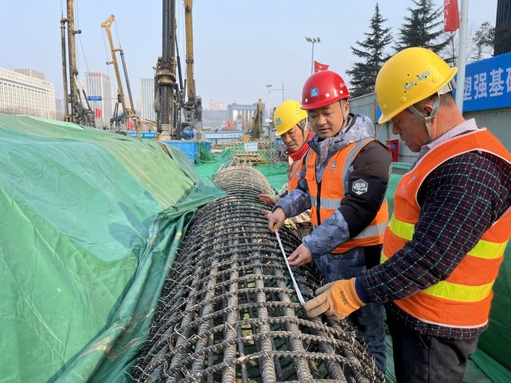 2024年2月9日,在中建八局承建的濟南軌道交通7號線一期工程的龍奧大廈站施工現場,質量工程師劉學(中)在檢查鋼筋籠焊接質量。新華社發