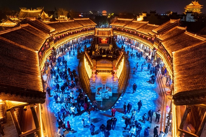 春節期間,臺兒莊古城華燈初上,大街小巷燈火通明,游人如織,流光溢彩,呈現出了一座璀璨奪目的不夜之城。絢麗多姿的燈光讓古城充滿濃濃的節日氛圍。(記者 岳娜 通訊員 孔闖 攝)