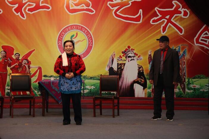“新時代來新風(fēng)尚,文明之花滿園香;革除陋習(xí)樹新風(fēng),鄉(xiāng)村振興譜新章......”棗莊市嶧城區(qū)壇山街道徐樓社區(qū)藝術(shù)團的團員們正在新時代文明實踐站內(nèi)表演“村晚”節(jié)目柳琴戲《退彩禮》。