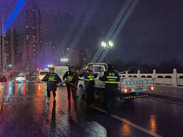 市中區城管系統累計出動工作人員1000余人次,20余輛執法車,10輛鏟車,5輛運輸車,6部除雪車,2部融雪劑撒布機,15噸融雪劑和人工除雪工具600余套,對轄區內主要道路、橋梁、立交橋、下穿隧道周邊進行全覆蓋除雪作業,防止路面結冰。