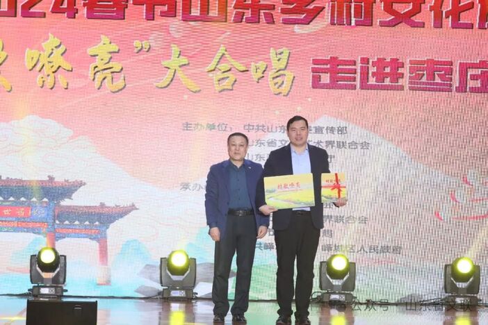 演出期間,“村歌嘹亮·2024山東省新時代鄉村歌曲創作征集展演活動”啟動儀式舉行,孫文利、何思清、張國洲、陳永生為活動揭牌,正式拉開本年度鄉村歌曲征集展演活動帷幕。馬述興代表省文聯向棗莊嶧城區贈送“村歌嘹亮·2023山東省新時代鄉村歌曲創作征集展演活動”優秀村歌作品集。