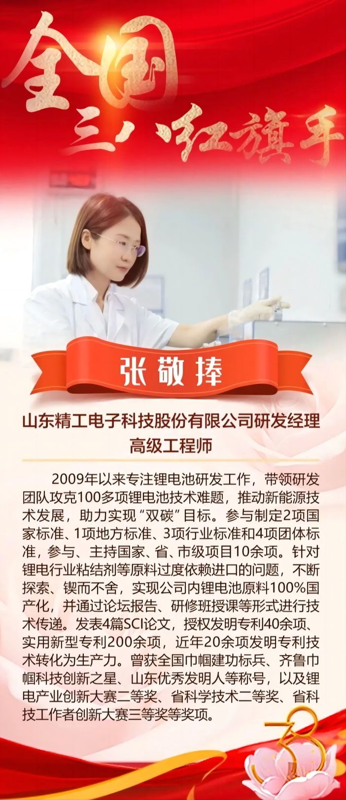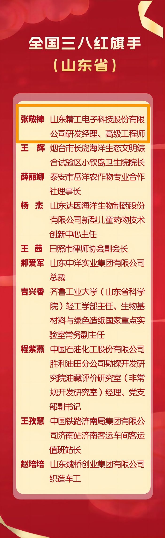山東省10名個人榜上有名。其中,棗莊市精工電子科技股份有限公司研發經理、高級工程師張敬捧被授予全國三八紅旗手榮譽稱號。