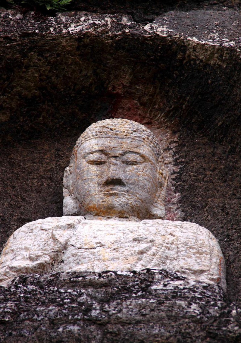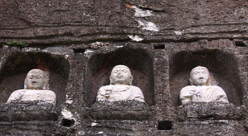 佛像雕刻在距平地高6米左右的懸崖處,壁龕四周有為搭架板而鑿的小洞。五尊造像的中間為3個(gè)佛,左右為力士,除右士為高浮雕外,其余均為圓雕,佛像高度在1.5米左右。