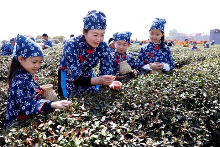 4月5日,在棗莊市孟莊鎮大郭莊茶園,茶農在向小學生傳授采摘清明茶技巧、小學生在體驗采摘清明茶。(大眾日報·大眾新聞客戶端記者 張環澤 通訊員 吉喆 報道)