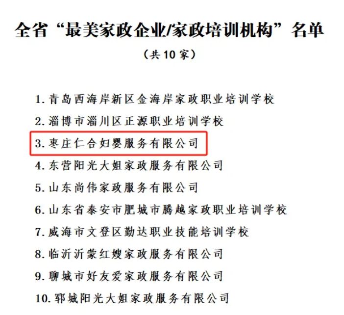 棗莊仁合婦嬰服務有限公司榮獲全省“最美家政企業/家政培訓機構”