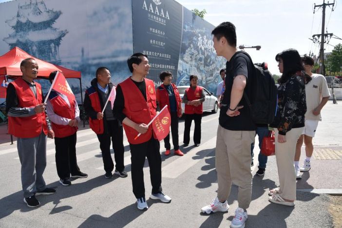 “5.1”假期期間,在棗莊市臺(tái)兒莊區(qū)古城景區(qū),一群50人身穿紅馬甲的由退役軍人組成的大運(yùn)河志愿服務(wù)隊(duì)的志愿者們分時(shí)段的活躍在景區(qū)26個(gè)點(diǎn)、處。他們用實(shí)際行動(dòng)向游客傳播文明旅游理念,提供出行安全宣傳、道路引導(dǎo)等服務(wù),讓苔花開遍大運(yùn)河兩岸,確保景區(qū)旅游秩序井然。
