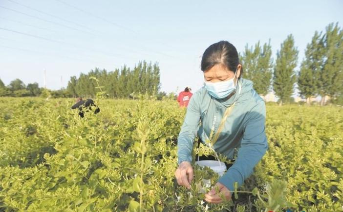 初夏時(shí)節(jié),棗莊市市中區(qū)光明路街道東垎塔埠村的120余畝金銀花喜獲豐收,村民正忙著采摘。