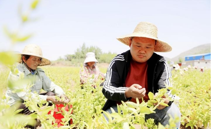 5月14日,在棗莊市龍門觀生態種植農民專業合作社內,農民正在采摘金銀花。(記者 岳娜 通訊員 王啟蒙 彭星翔 攝)