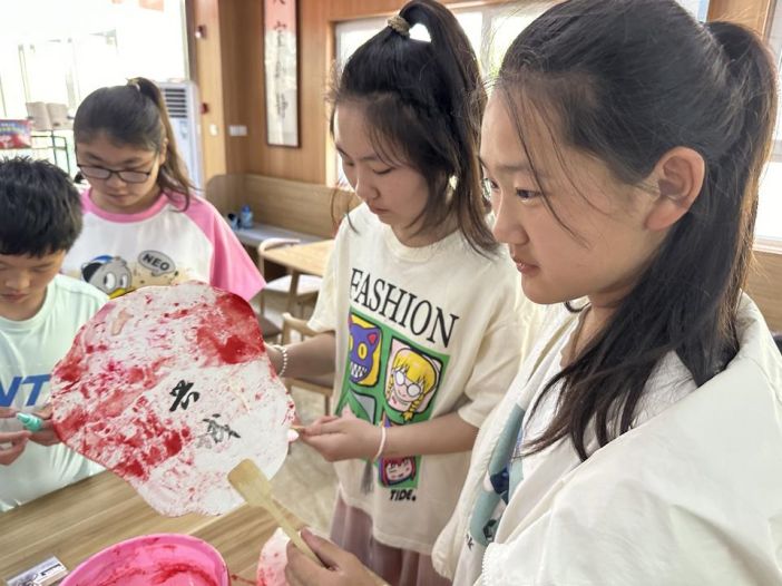 在志愿者的指導下,孩子們將扇面輕輕壓置水中,憑借水面張力讓色漆自由蔓延,當扇子從水中拎起時,一把把繪出了形色各異精美圖案的扇子便制作完成了。