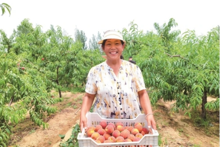果農(nóng)在滕州市東郭鎮(zhèn)上戶主村一處果園展示剛采摘的毛桃(張勝利 攝)