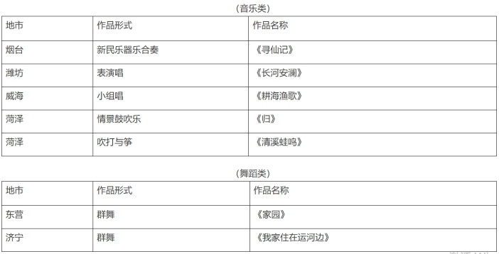 為進一步推動全省群眾藝術創演工作,備戰第十四屆中國藝術節“群星獎”,山東省文化和旅游廳于2024年3月在全省組織開展了新一輪群眾藝術優秀新創作品征集工作,收到各地(單位)報送作品共276件。經組織專家嚴格評審,評選出2024年度群眾藝術優秀新創作品19件,其中音樂類作品5件,舞蹈類作品2件,戲劇類作品7件,曲藝類作品5件。