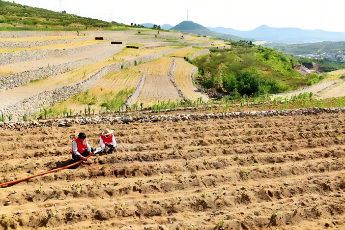6月26日,在山亭區水泉鎮南蔣村,黨員志愿者在幫助村民灌溉地瓜。