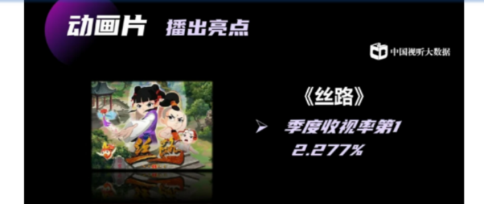 近日,根據(jù)《中國視聽大數(shù)據(jù)》發(fā)布的數(shù)據(jù),52集動畫片《絲路》,在2024年第一季度的動畫片類全國收視率為2.277%,居全國第一。