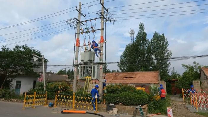 大辛莊村全村用電戶672戶,由兩臺400千伏安、一臺315千伏安和一臺200千伏安的變壓器供電。近期持續高溫,稅郭供電所員工在對設備監測時發現,村西的200千伏安變壓器有重載現象,第一時間按照施工計劃流程上報增容方案。考慮到天氣炎熱,施工時間定在早上6點就開始,既能避開村民用電高峰,又保證了施工人員高溫作業安全。