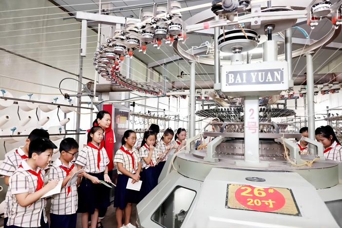 7月28日,小學生在市中區稅郭鎮一家紡織服裝企業的織布車間了解生產情況。