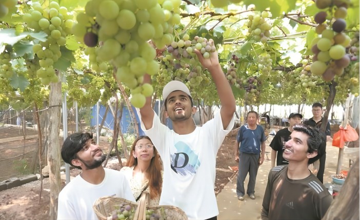 來自巴基斯坦的Muhammad Rehman說:“這里的環境好,有大片葡萄田和高產葡萄。在采摘園里,我們看到了不同類型的葡萄,有冰糖和牛奶雙重口感的,有水潤飽滿、口感甘甜的,非常好吃,我真的很喜歡這里,真的很享受這里的環境,享受我在這里的時光。以后有機會,我想把一些幼苗帶回巴基斯坦,讓中國的葡萄在巴基斯坦吐芬芳。”