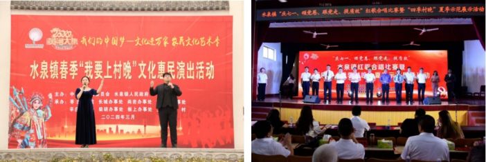 該鎮成功舉辦了棗莊市“四季村晚”,水泉鎮春季“我要上村晚”文化惠民演出活動,及“慶七一、頌黨恩、跟黨走、提質效”水泉鎮紅歌合唱比賽暨棗莊市“四季村晚”夏季示范展示活動。豐富群眾文化生活,傳承和弘揚優秀傳統文化,激勵更多老百姓參與組建自己的全“民”星隊伍,打造更加充實、更為豐富、更高質量的鄉村文化生活,為鄉村振興注入新的活力和動力。同時謳歌中國共產黨成立以來的光輝業績和偉大成就,激勵廣大黨員干部以實際行動踐行黨的初心使命,并推動鄉村文化振興。