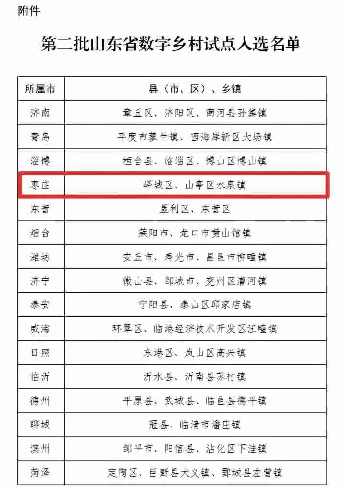 根據《關于開展第二批山東省數字鄉村試點工作的通知》(魯網辦通字〔2024〕27號)安排,省委網信辦、省發展改革委、省工業和信息化廳、省民政廳、省生態環境廳、省農業農村廳、省商務廳、省文化和旅游廳、省市場監管局、省大數據局、人民銀行山東省分行、省通信管理局等部門共同開展了第二批山東省數字鄉村試點評選工作。經各市各部門初選推薦、專家評審、部門征求意見等環節,聯合評選出擬作為第二批山東省數字鄉村試點的39家單位。其中,我市嶧城區、山亭區水泉鎮入選。