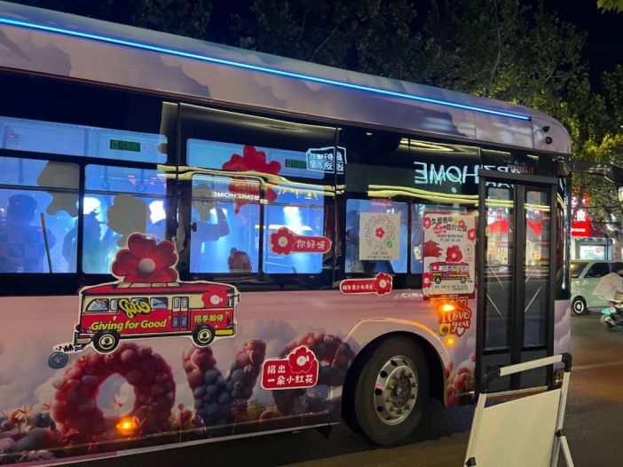 9月6日至7日晚上,一輛車內車外都涂有“騰訊99公益”元素的公交車出現在市中街頭,車內布有燈球、麥克風、點歌臺等專業設備。這輛公交從東湖廣場出發,途經光明廣場——吉品街——老果品批發市場再返回東湖廣場。沿途在公交站臺???,市民可招手示意上車,體驗“party公交車”并參與公益活動。