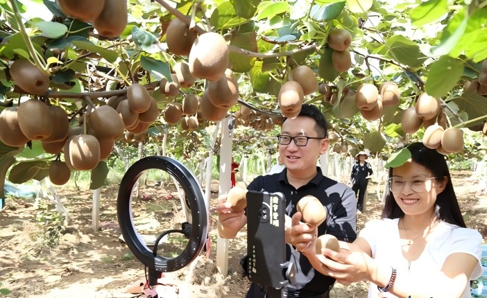 圖為9月6日,市委統戰部派駐轆井南莊村第一書記李陽(左一)在山亭區超遠獼猴桃園網上直播銷售獼猴桃。(記者 劉明 通訊員 徐海翔 攝)