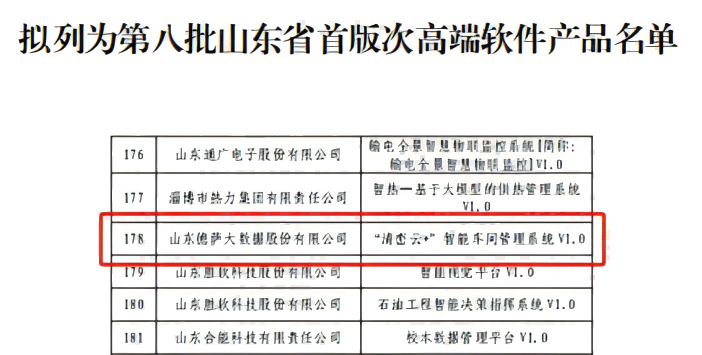 9月12日,省工業(yè)和信息化廳公布了第八批山東省首版次高端軟件產(chǎn)品公示名單,山東德薩大數(shù)據(jù)股份有限公司“清巒云+”智能車間管理系統(tǒng)V1.0成功入選。截至目前,全市已有累計(jì)5家企業(yè)的10個(gè)軟件產(chǎn)品被認(rèn)定為全省首版次高端軟件產(chǎn)品。
