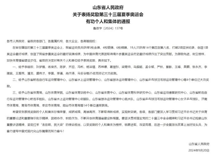 9月20日,山東省人民政府網站發布關于表揚獎勵第三十三屆夏季奧運會有功個人和集體的通報,全文如下: